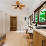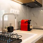 Een keuken met een koffie/theezetapparaat, een koelkast en keukengerei is beschikbaar in dit appartement, samen met koffie- en theevoorzieningen.
